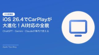 2026年3月24日リリースのiOS 26.4で、CarPlayにAIチャットボット(ChatGPT・Gemini・Claude)対応とAmbient Musicウィジェットが追加。新機能の詳細・設定方法・注意点をわかりやすく解説します。